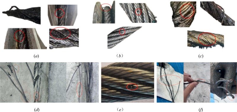 | External wear | Metal contact | Visual inspection | Sheaves, sleeves, or padding |