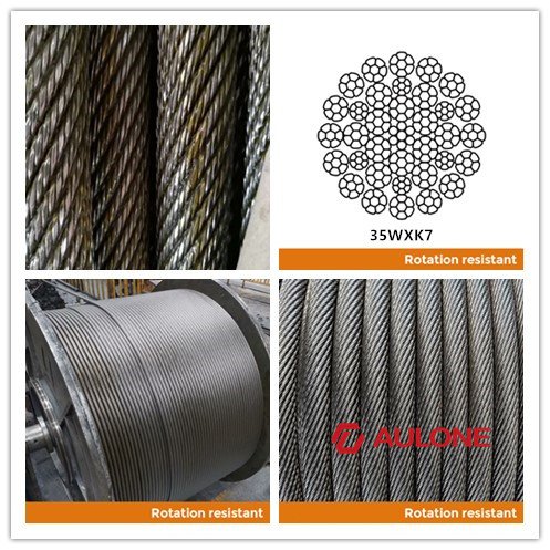 35WXK7 reduces hook rotation because its inner and outer layers twist in opposite directions, balancing torque and keeping the load stable during lifting.